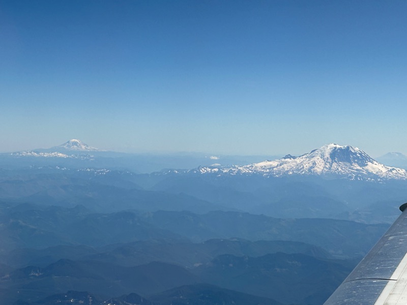 Wow! A perfectly clear sky flying in and out of Seattle today! Both Mount Rainier and Mount Hood are visible. A true rarity!