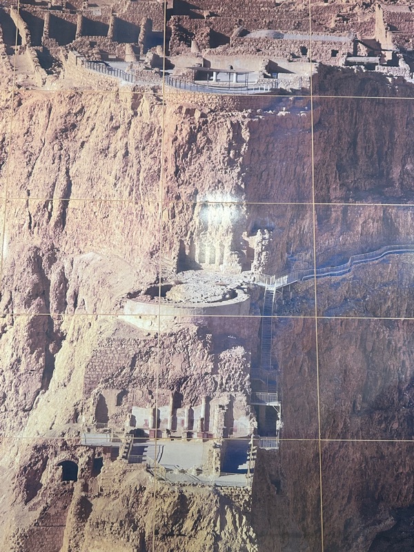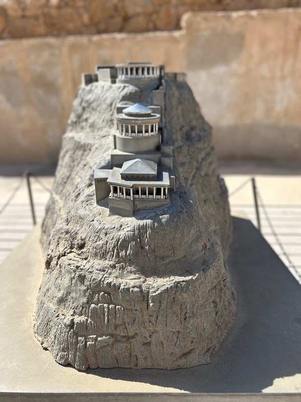 A photograph of Masada after the earthquake. And below, a model before the earthquake.