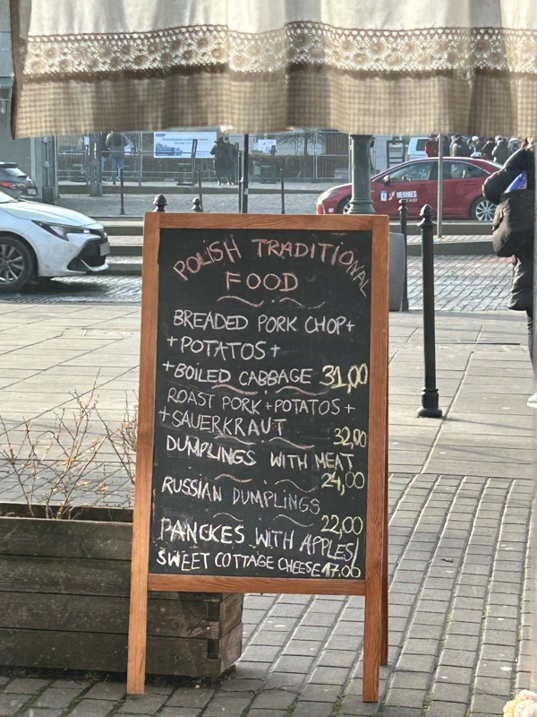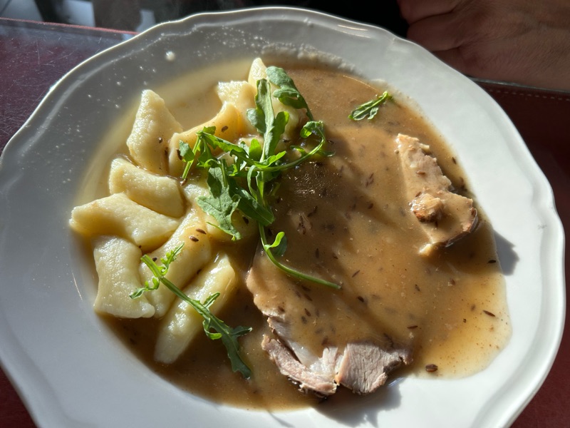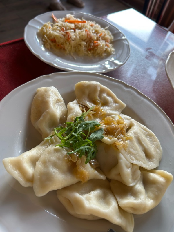 Aptly, the day was cloudy and cold, and when we had come to the end of the tour, Plus One and I were ready for an inside, sit-down, comfort food lunch. We crossed the street and went into the first place we came to, and it was a happy ending to a sad two-and-a-half hours. The food was listed as Polish, but it was reminiscent of my German grandmother’s cooking 💕.