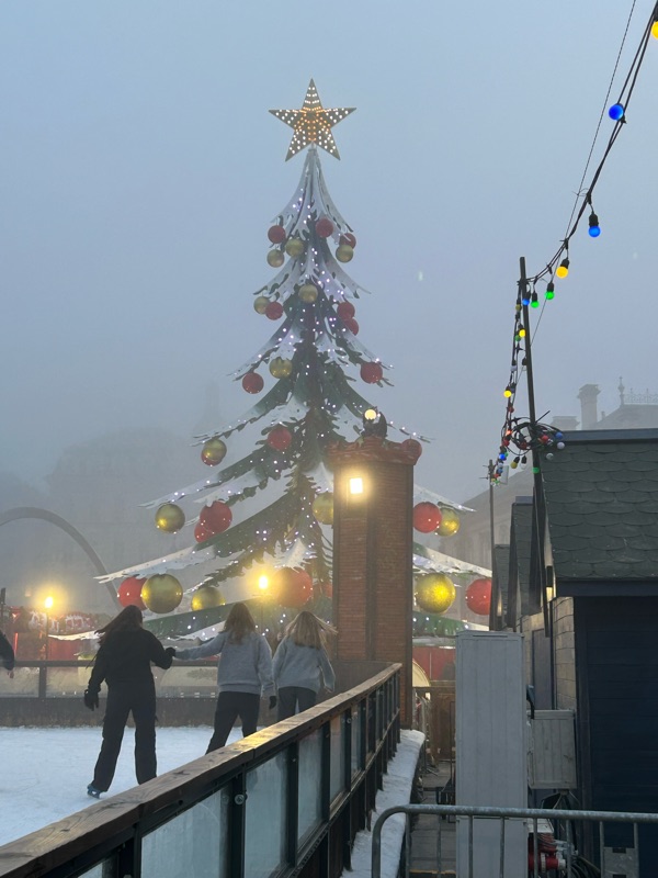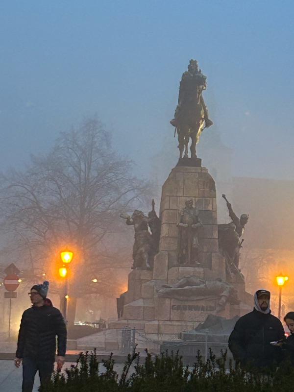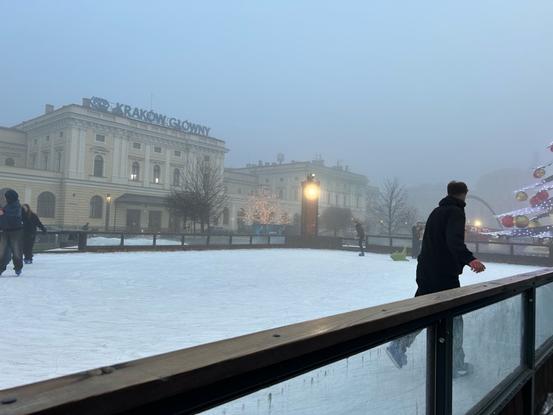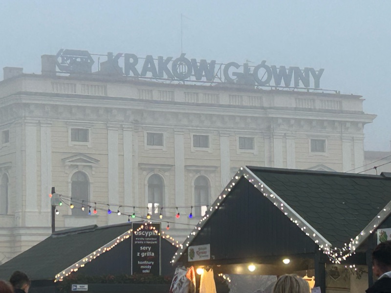 We were quite a ways away from our hometel when the tour ended, so we hopped on a train and rode back to the Glowny Station, where we originally arrived just two nights past. We knew how to navigate our way back to Szlaka Street from there, so we decided to enjoy a miniature version of a Christmas market near the station since we had the time. By now it was starting to get dark, and it was only about 3:40 PM!π± but it made the Christmas lights shine all the brighter. It has been foggy all day as well, and the fog seemed to grow thicker as evening wore on. It added a surreal ambiance to pretty much everything, and I think Dean was getting tired of me saying…’I just love this fog!’π