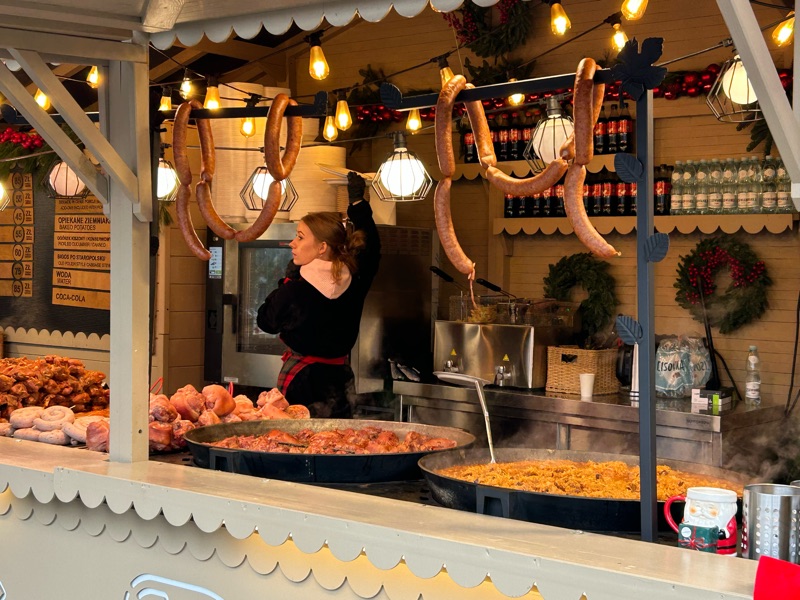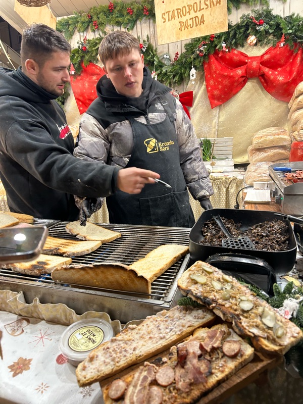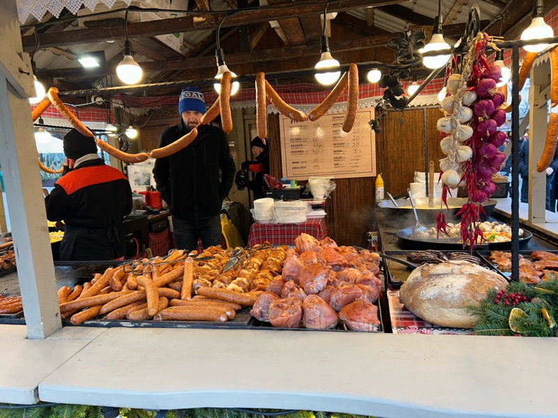 The woman above is grilling smoked cheese, one of which is wrapped in bacon. The other is served with cranberry. We got one of each, double dipped in the cranberry sauce, and were happy as can be!  By now we were very cold, so for the remainder of our walkabout and the trek home, we sipped on steaming, thick and decadent hot cocoa😆.