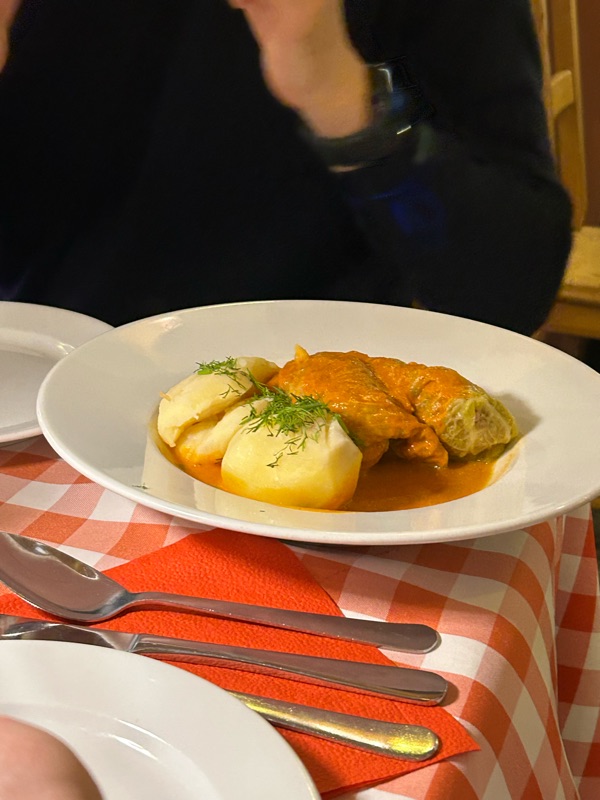 I can’t remember what Kuba called this, but they reminded me of pigs in a blanket.☺️ And of course, everything is served with the proverbial potato, kraut, or pickles๐๐!