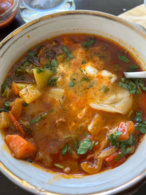 I’m not sure what anything is. The two young gals couldn’t speak English well enough to describe anything, and the menu was in Russian I believe…πππ So I just pointed the pictures, and that’s what I got. The soup tastes rather like borscht, and I haven’t tried the other thing yet, so stay tuned for more… Adventures with Erin πππ!