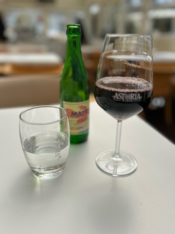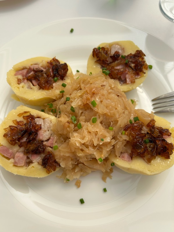 When I was done wandering the grounds, I stopped into a small café on the campus of the fort and had potato dumplings stuffed with smoked ham, and a refreshing ‘still water’, along with a glass of a tasty Merlot 🍷.